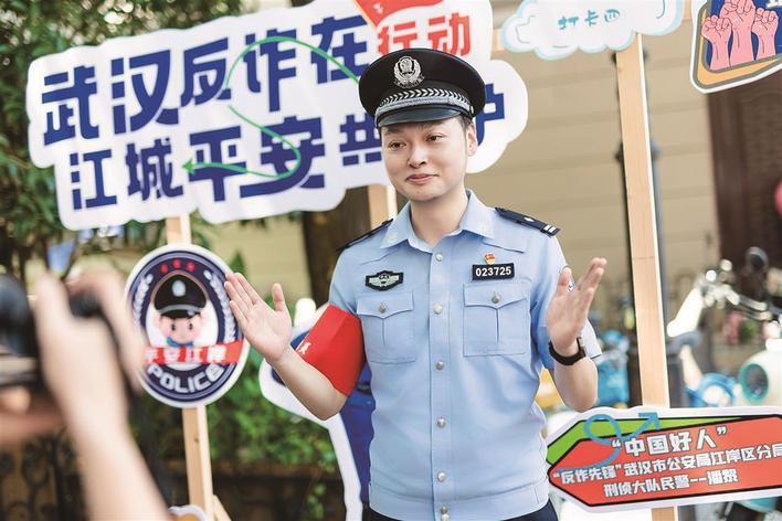 7月8日,潘黎和同事们来到江岸区黎黄陂路步行街“巴公房子”网红打卡地,开展“全民反诈在行动”系列主题宣传活动。潘黎手中的毛绒“警察小熊”,自制录音不停地用武汉话说:“陌生电话要警惕,可疑短信要注意。任凭骗术千万变,不贪便宜不受骗……”引来行人纷纷驻足。