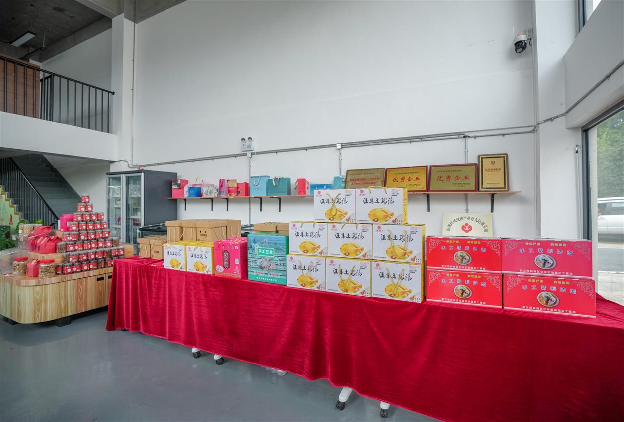 在公司的带动下,不少村民开始把自家农产品交由公司代为销售。金黄的玉米、香甜的黄桃、玲珑的小番茄、农户专供的土鸡蛋、毛冲村的古法红糖、远近闻名的汪集土鸡汤、地道的张店鱼面、手工制作的豆丝……琳琅满目的特色农产品,源源不断地通过公司走向更广阔的市场。仅土鸡蛋一项,平均日销量就达300个。