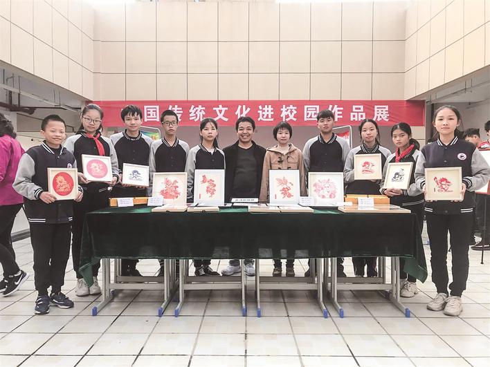 葛海(中)和学生参加传统文化进校园作品展 通讯员供图