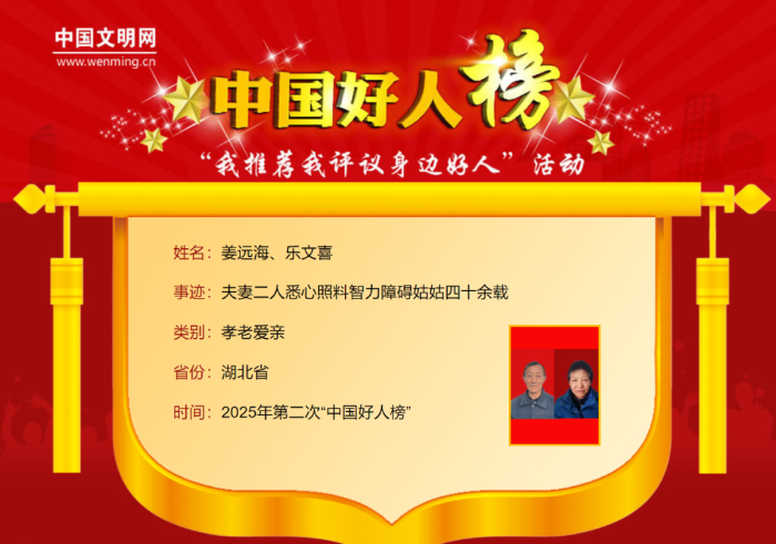 姜远海、乐文喜:夫妻二人悉心照料智力障碍姑姑四十余载(十堰市)