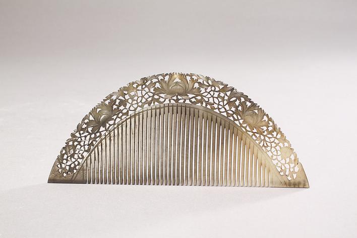 “香喷瑞兽金三尺,人插云梳玉一弯”,江苏南京南宋墓出土的半月形薄片玉梳,和田玉质地,梳齿制作规整,梳背上采用透雕工艺细致雕琢出三朵盛开的牡丹和两朵待放的花苞,间以细密的缠枝,雕工精湛,构图雅致,代表了南宋时期江南地区卓越的治玉水平,直观展现了辛弃疾笔下女性插梳的美好形象。