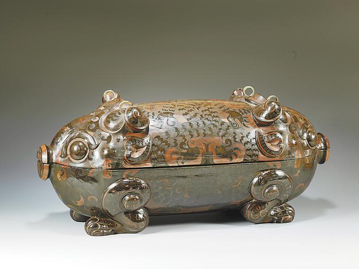 浙江绍兴漓渚镇小步村瓦窑山出土的战国原始瓷兽面鼎,仿青铜鼎形制,口沿一端塑一兽首,额上有火焰形冠状物横立,眼睛向外鼓出,面目狰狞。另一端置一走兽,头露口沿,张嘴卷尾,似欲食鼎中之物。釉色青黄,光亮润泽,堪称原始瓷中之珍品。