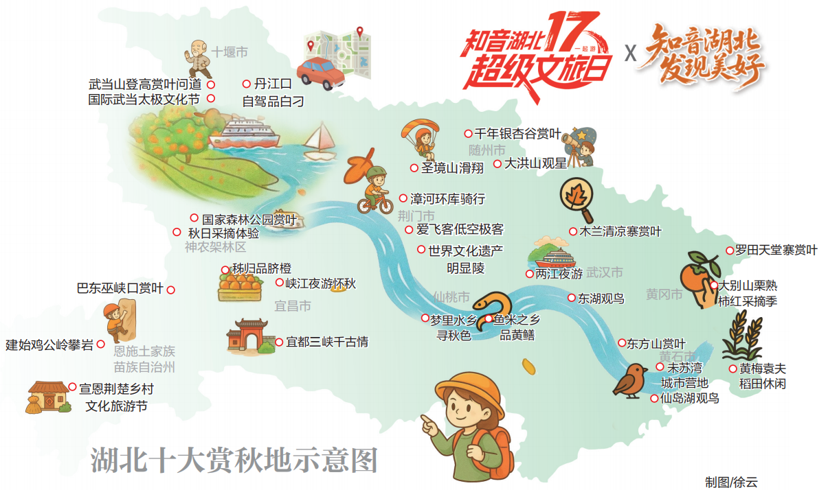 本次活动重磅发布的十大赏秋地,是经省文化和旅游厅与湖北日报传媒集团“发现美好”联合项目组推荐、精心筛选而来。十大目的地分别是:武汉(东湖观鸟、两江夜游、木兰清凉寨赏叶);黄石(东方山赏叶、未苏湾城市营地、仙岛湖观鸟);宜昌(峡江夜游怀秋、秭归品脐橙、宜都三峡千古情);十堰(武当山登高赏叶问道、国际武当太极文化节、丹江口自驾品白刁);黄冈(罗田天堂寨赏叶、大别山栗熟柿红采摘季、黄梅袁夫稻田休闲);随州(千年银杏谷赏叶、大洪山观星);荆门(圣境山滑翔、世界文化遗产明显陵、爱飞客低空极客、漳河环库骑行);恩施(巴东巫峡口赏叶、建始鸡公岭攀岩、宣恩荆楚乡村文化旅游节);仙桃(鱼米之乡品黄鳝、梦里水乡寻秋色);神农架(国家森林公园赏叶、秋日采摘体验)。