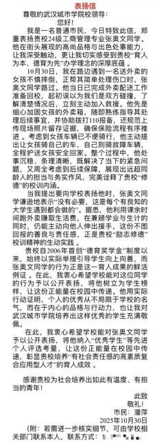 10月31日,武汉城市学院校长信箱收到一封来自市民潘萍女士的表扬信,信中讲述了该校2024级工商管理专业学生张奥文在勤工俭学途中,主动救助一名事故受伤的外卖女骑手,并骑行近二十公里护送其回家的暖心事迹。