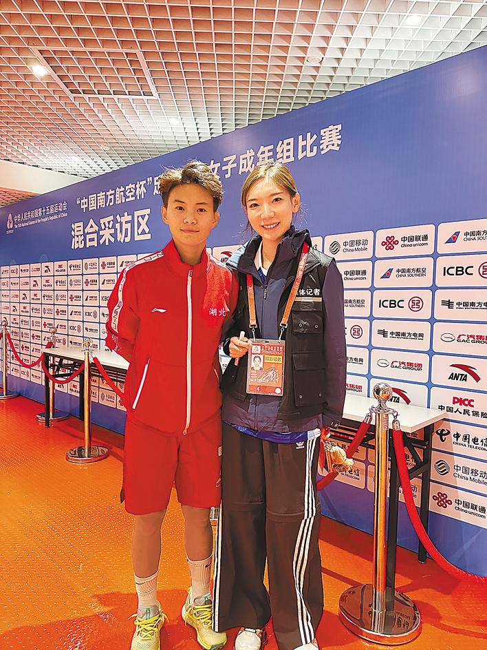 王霜(左)接受湖北日报全媒记者采访。 (湖北日报通讯员 李杰 摄)