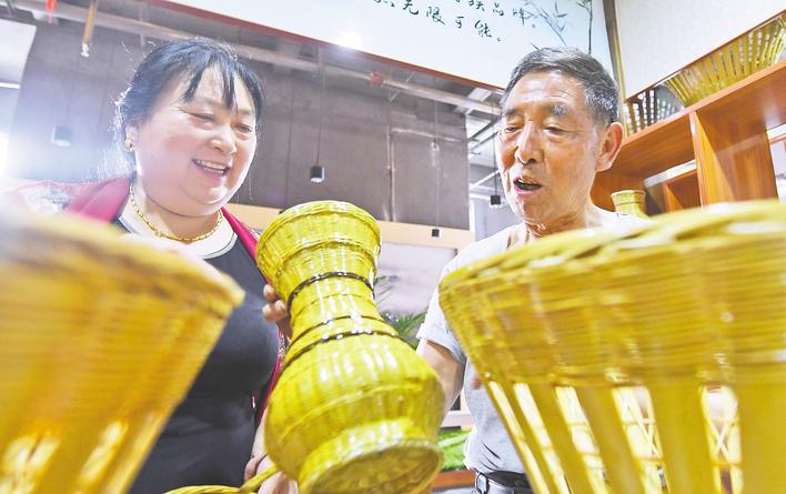 罗官章与大女儿李凤英一起研究土家竹编产品。(湖北日报全媒记者 刘曙松 摄)