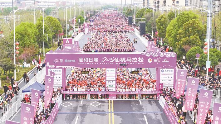 2025仙桃马拉松在新城大道鸣枪起跑,来自中国、肯尼亚、加拿大等3个国家的15000名选手用脚步丈量大美仙桃。(吴晴霄 摄)