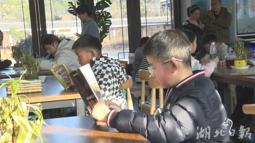 12月28日,随州广水市印台山文化生态园·城市书房,书架上各类书籍整齐排列,市民们或伏案细读,或低声交流,一派宁静祥和的阅读景象。