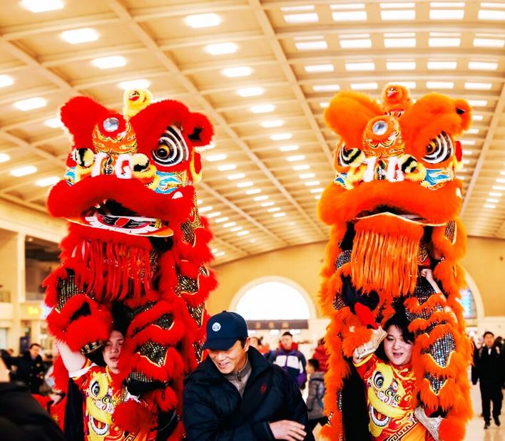 汉口站,民俗艺术舞狮表演吸引旅客驻足欣赏。 (张丹夫 摄)