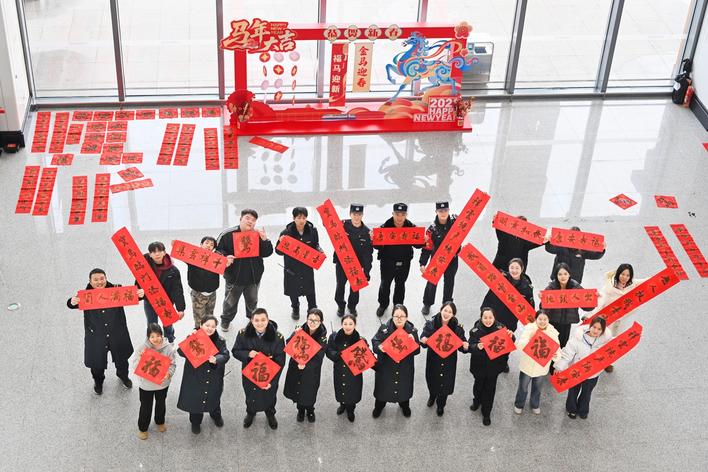 武汉站、武昌站的候车大厅暖意融融,红灯笼与中国结交相辉映,马年主题剪纸点缀其间,浓浓年味扑面而来。铁路老播音员“复古”的经典播报回荡在现代感十足的候车大厅,仿佛时光穿越,令人动容。书法家现场挥毫,一幅幅笔力遒劲的春联、一张张寓意吉祥的“福”字,被旅客欣喜收藏。皮影戏、剪纸、面塑等非遗展示台前人头攒动,旅客纷纷驻足观赏、拍照留念。歌曲串烧、滑稽戏、黄梅戏、器乐演奏等文艺快闪轮番上演,接地气的互动表演引得候车厅掌声雷动。