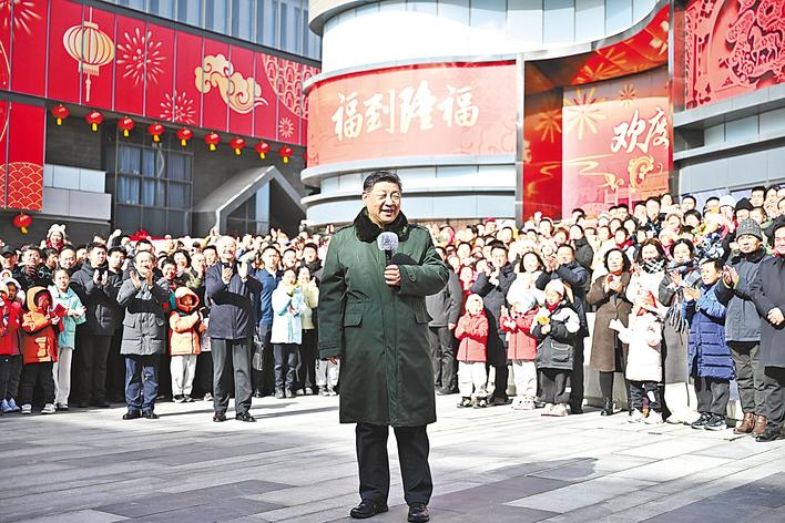 二月九日至十日,中共中央总书记、国家主席、中央军委主席习近平在北京考察并看望慰问基层干部群众。这是十日上午,习近平在东城区隆福寺街区考察时,向全国各族人民和香港同胞、澳门同胞、台湾同胞、海外侨胞致以美好的新春祝福。(新华社发)