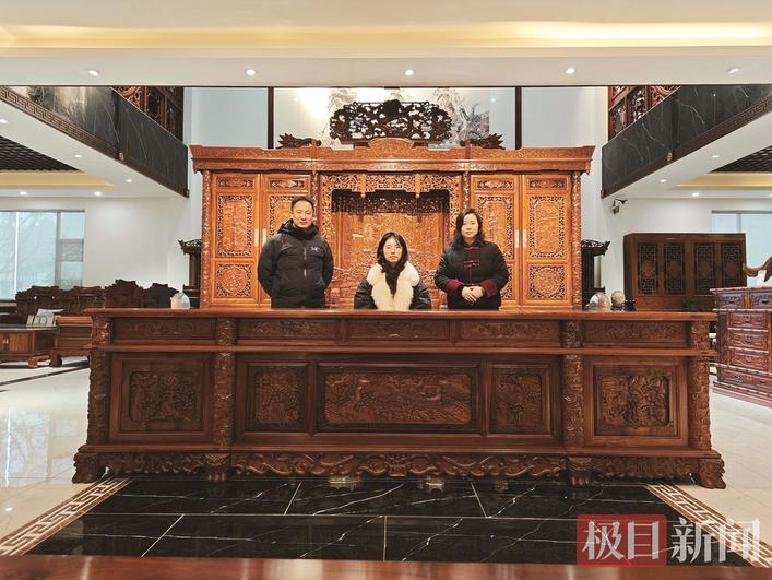 春节期间,极目新闻记者走进工坊产品陈列厅,花鸟鱼虫、龙凤呈祥等纹样跃然木上,传统中式美学扑面而来。一款老式雕花嫁妆樟木箱,凭借精湛工艺与美好寓意,标价8800元仍备受追捧,成为不少新人青睐的陪嫁佳品。