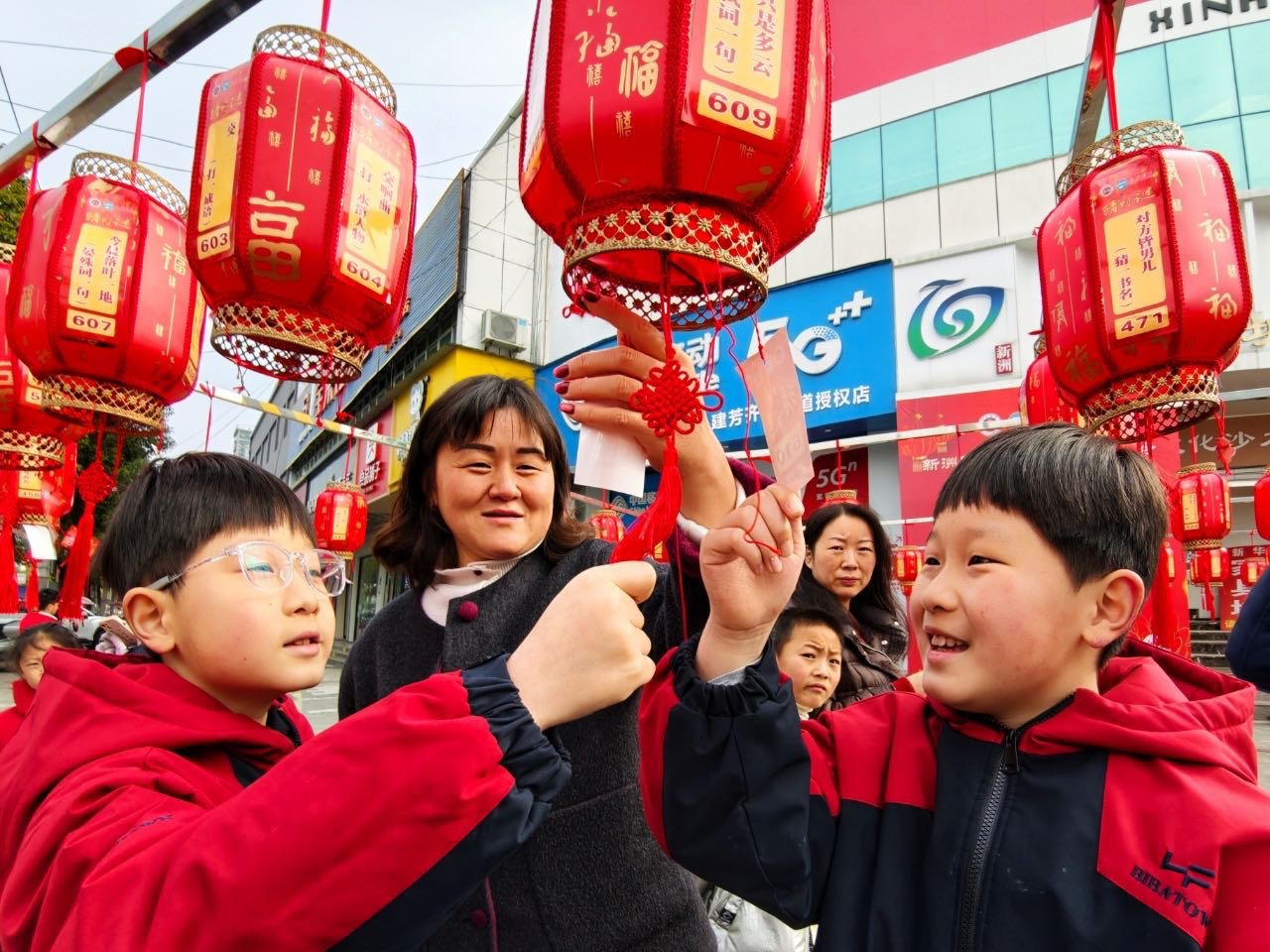 活动现场,千余盏红灯笼错落悬挂,红色谜面纸条随风轻摆,形成一条独具特色的“灯谜长廊”。市民们扶老携幼,穿梭其间,或凝神思索、或结伴探讨、或高声应答,现场欢声笑语不断,年味与书香交融。“这个谜面我猜出来了,是不是这个答案?”市民王女士拿着选中的谜面,兴冲冲地走到对谜处询问,在得到工作人员肯定答复后,开心地接过谜底牌,“猜中了太有成就感了,而且还能领奖品,这种过节方式特别有意义!”